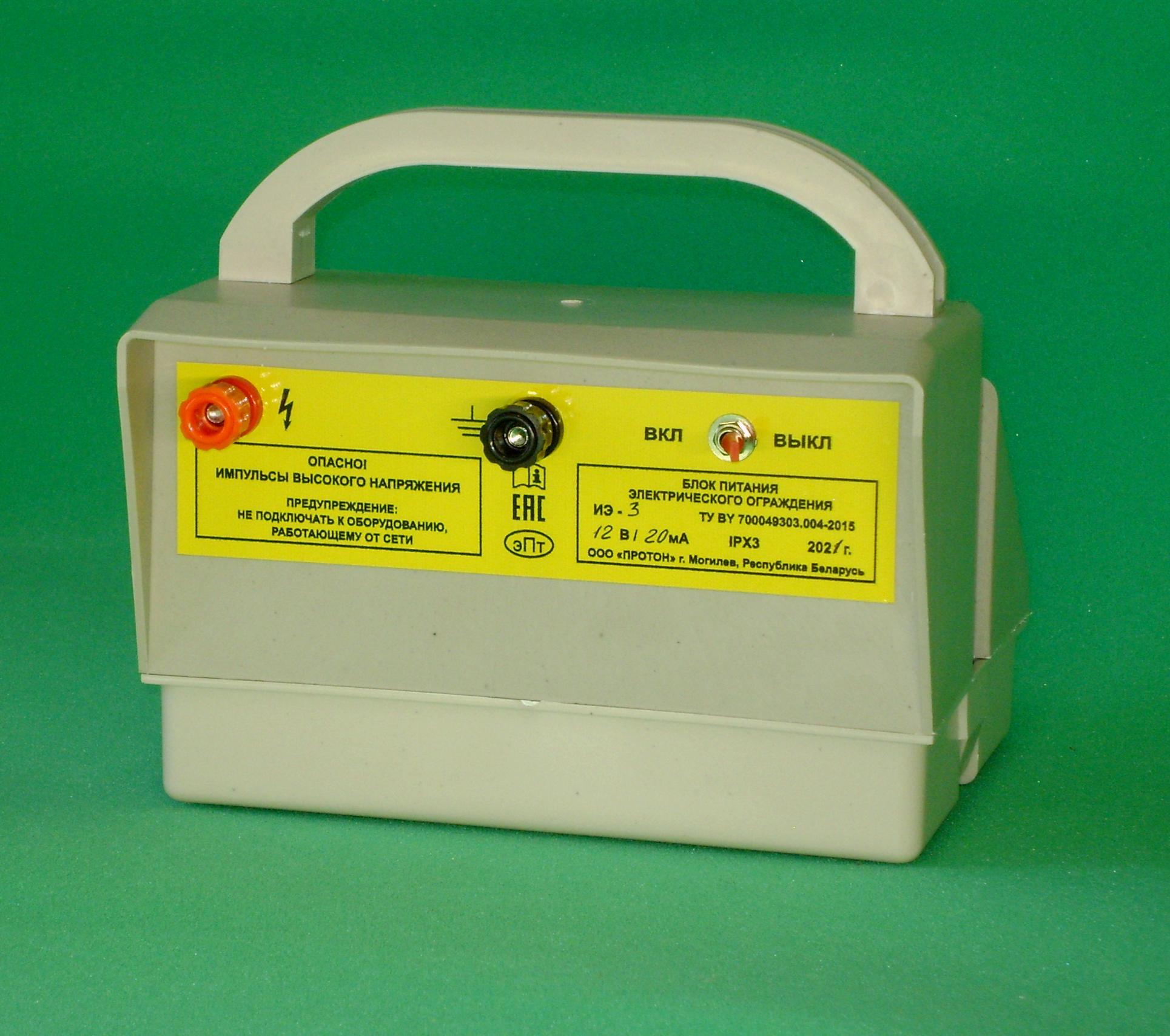 Блок питания электрического ограждения ИЭ-3 работает только от встроенной аккумуляторной батареи 12 вольт.